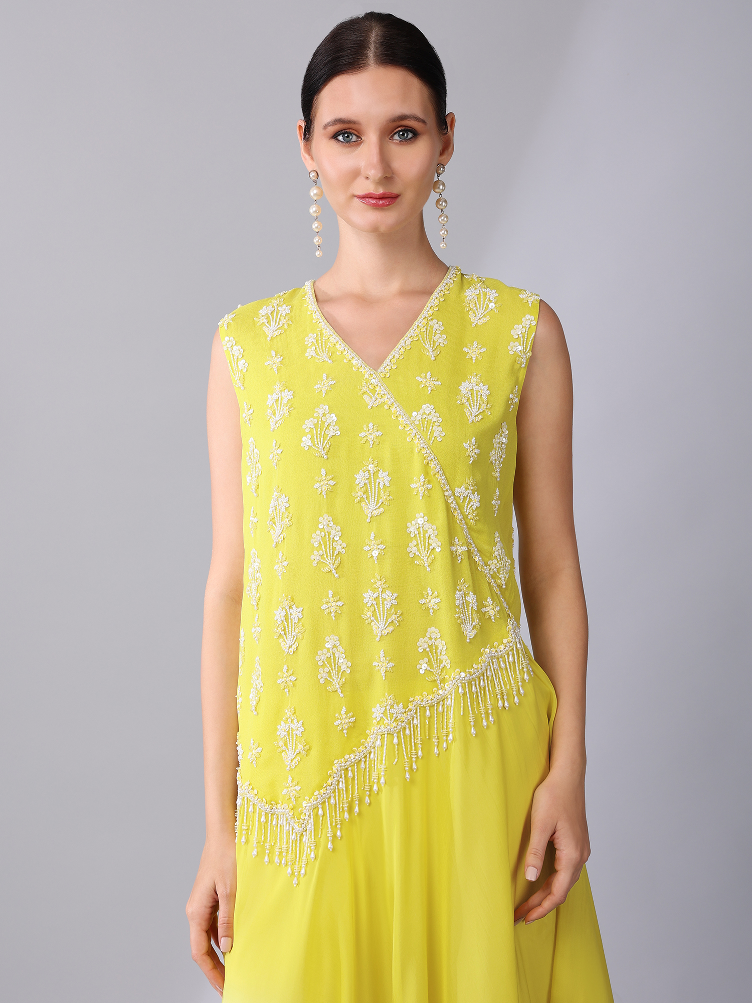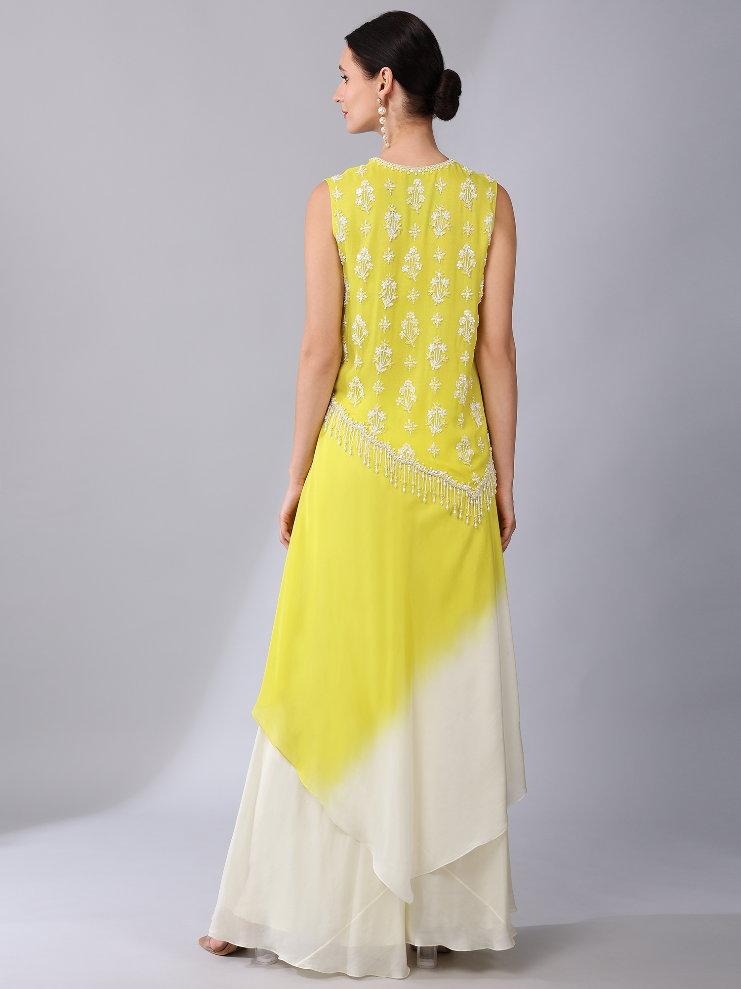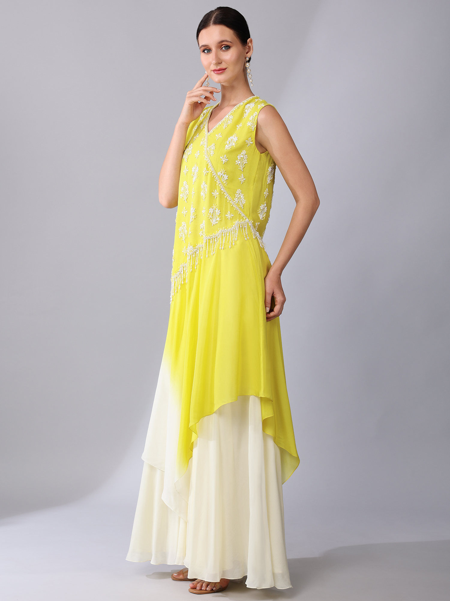 IVORY/ LEMON BEAD EMBROIDERED OMBRÉ SILK ORGANZA TUNIC PAIRED WITH A FLARE IVORY SILK ORGANZA PALAZZO