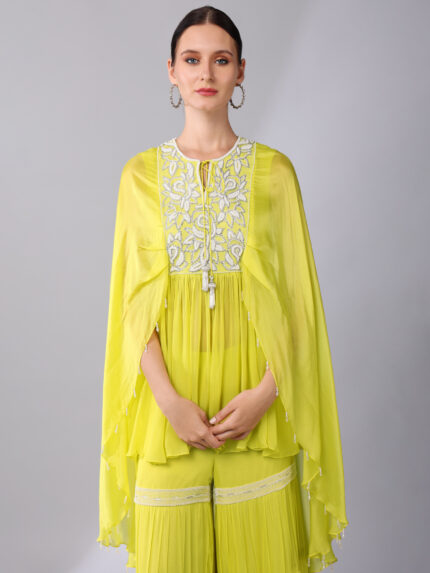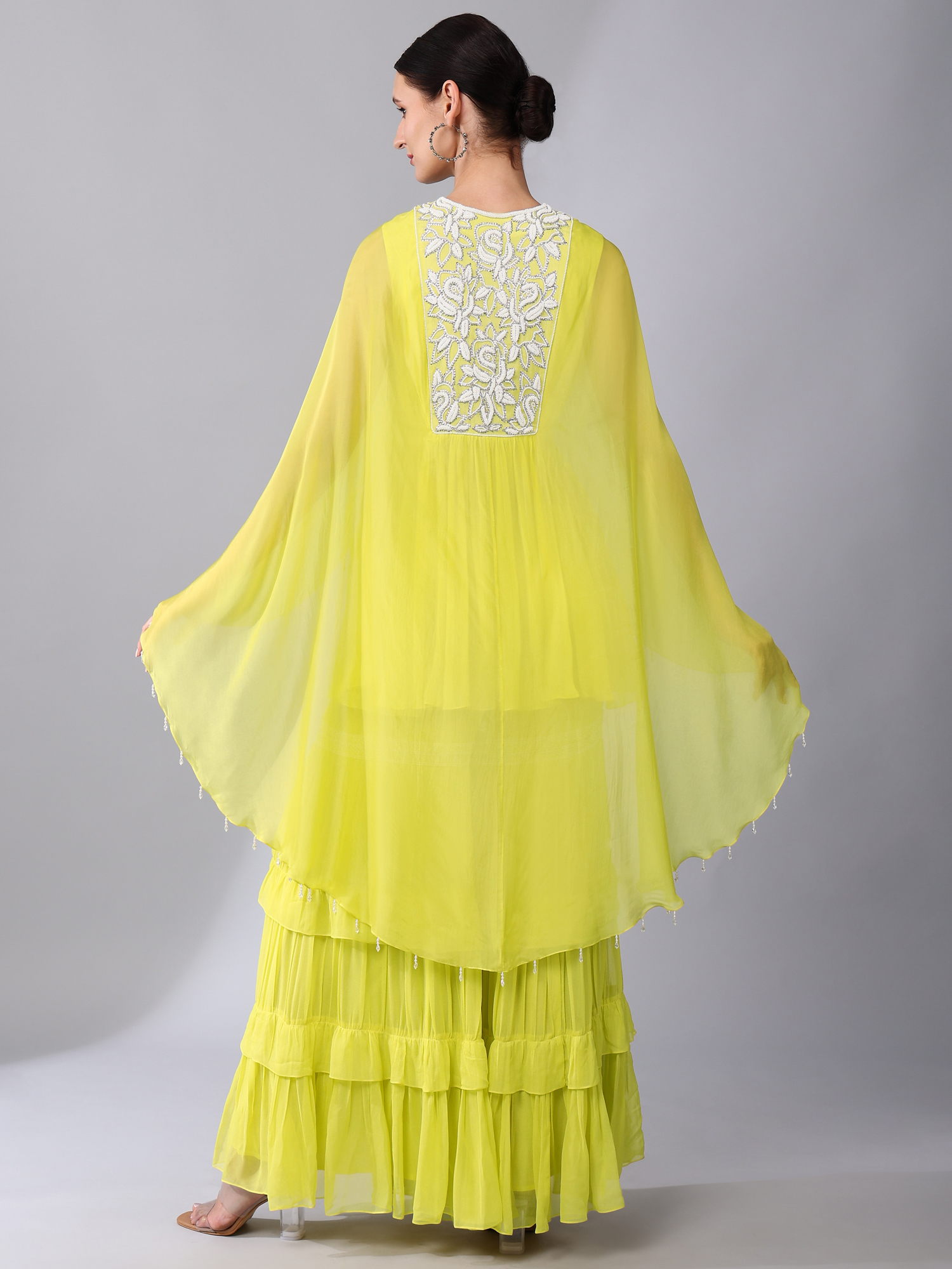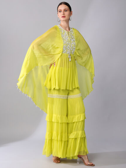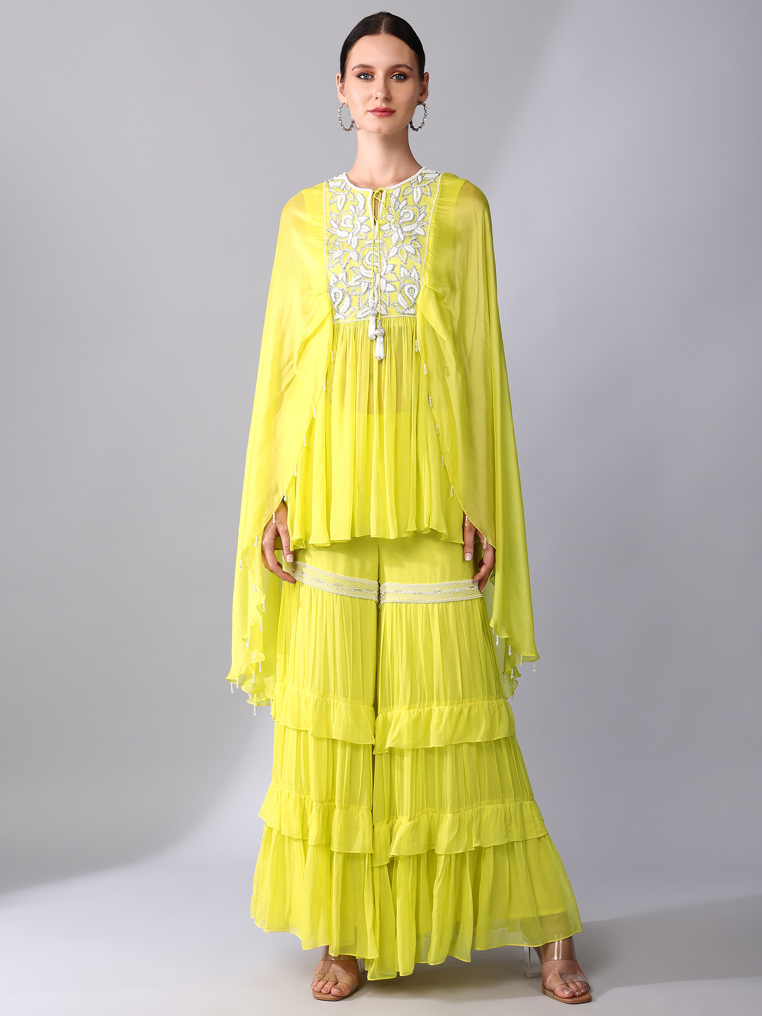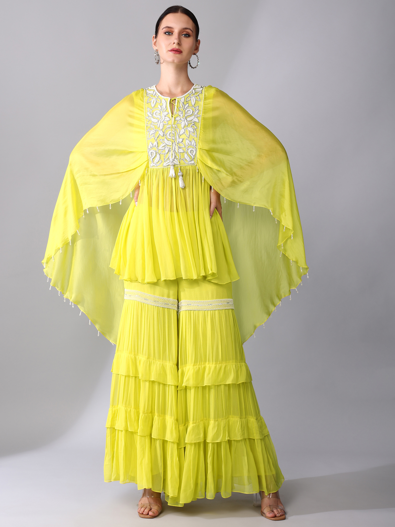 SILVER SEQUINS & PEARL EMBROIDERED ORGANZA SILK YOKE CAPE TUNIC PAIRED WITH A EMBROIDERED BAND TIER GEORGETTE GHARARA