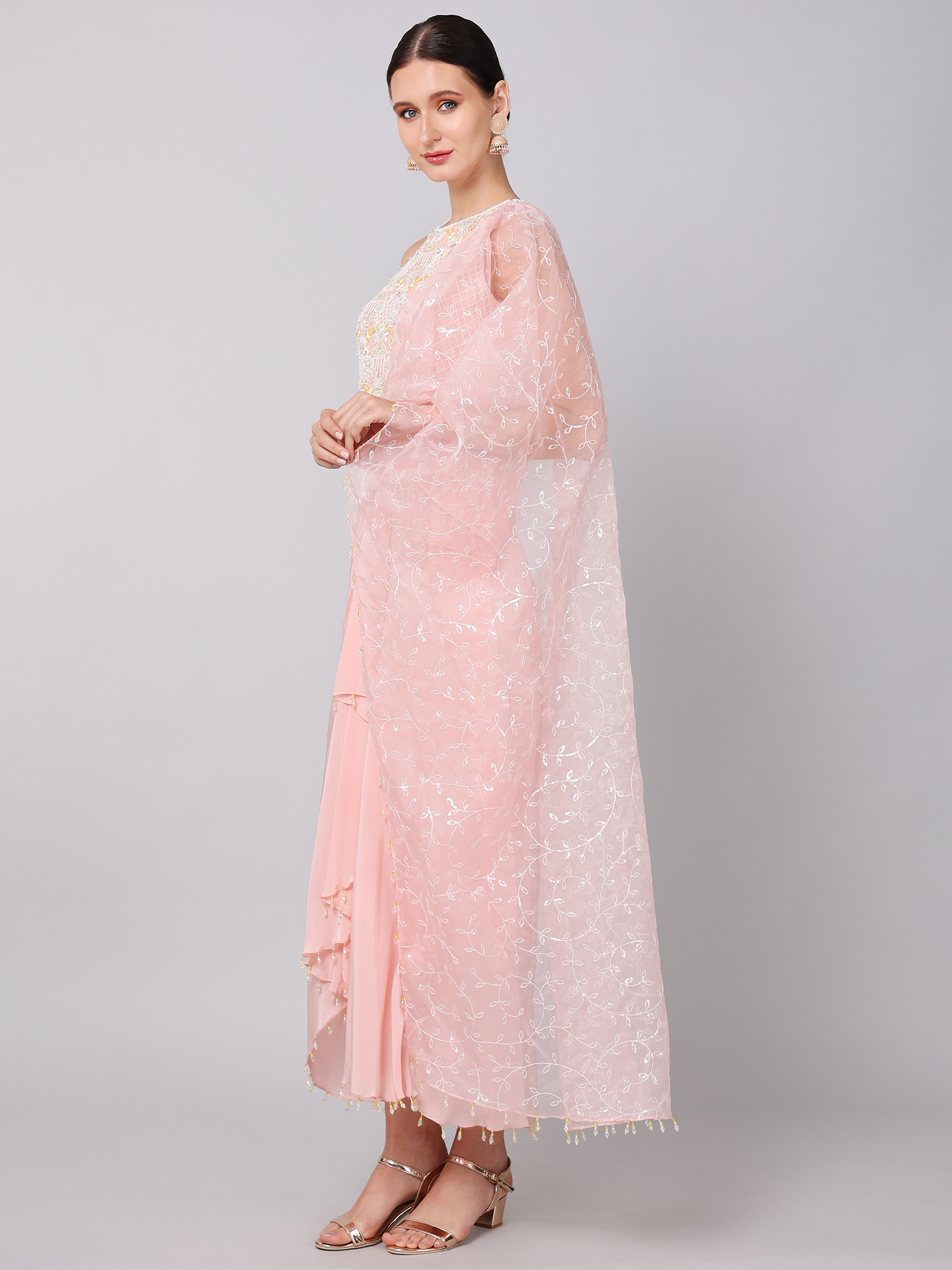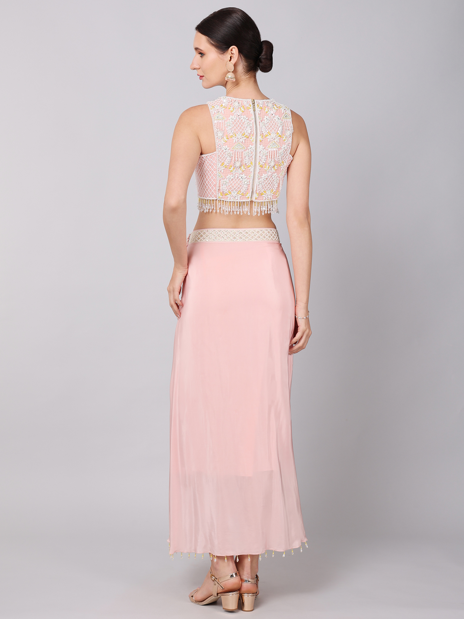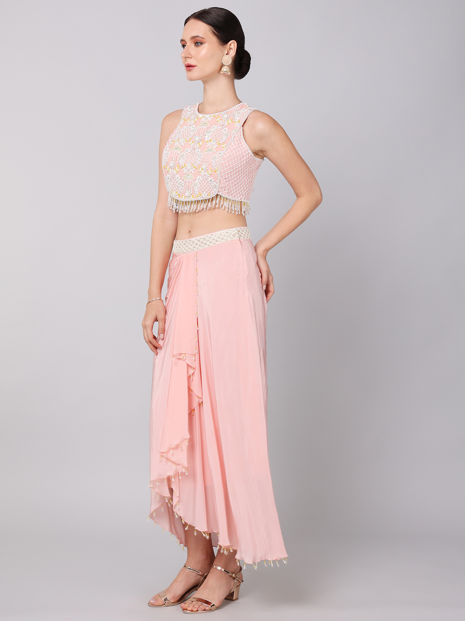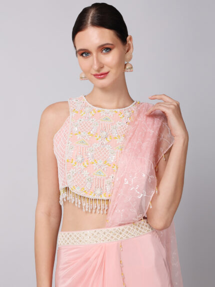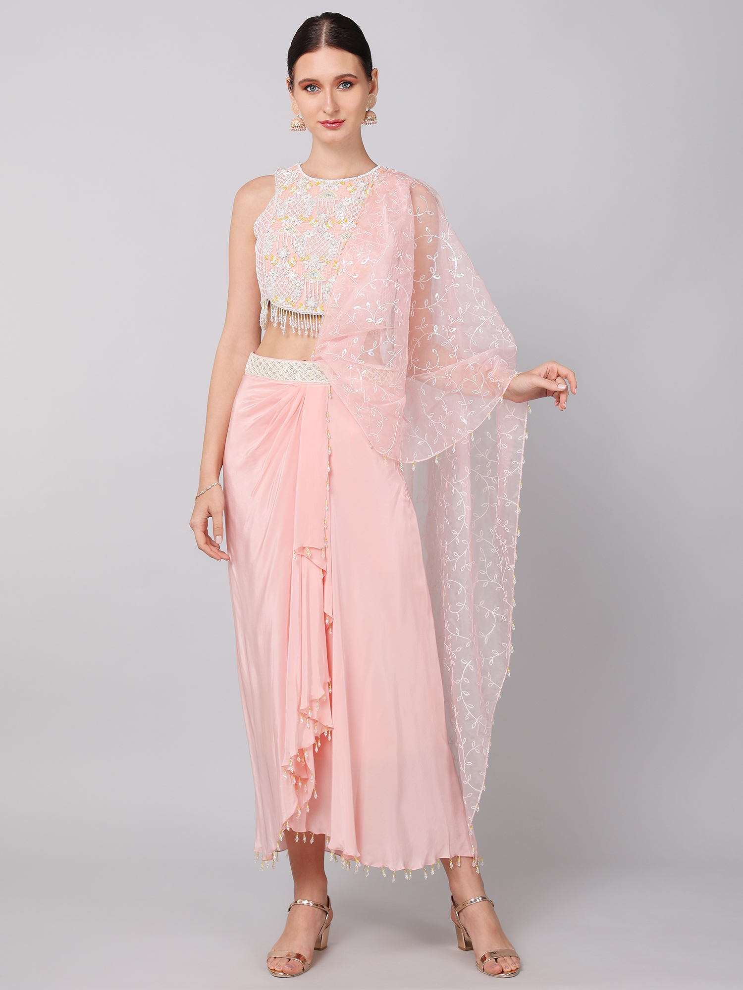 EMBROIDERED CROPTOP PAIRED WITH A CREPE SKIRT & AN EMBROIDERED ORGANZA DRAPE
