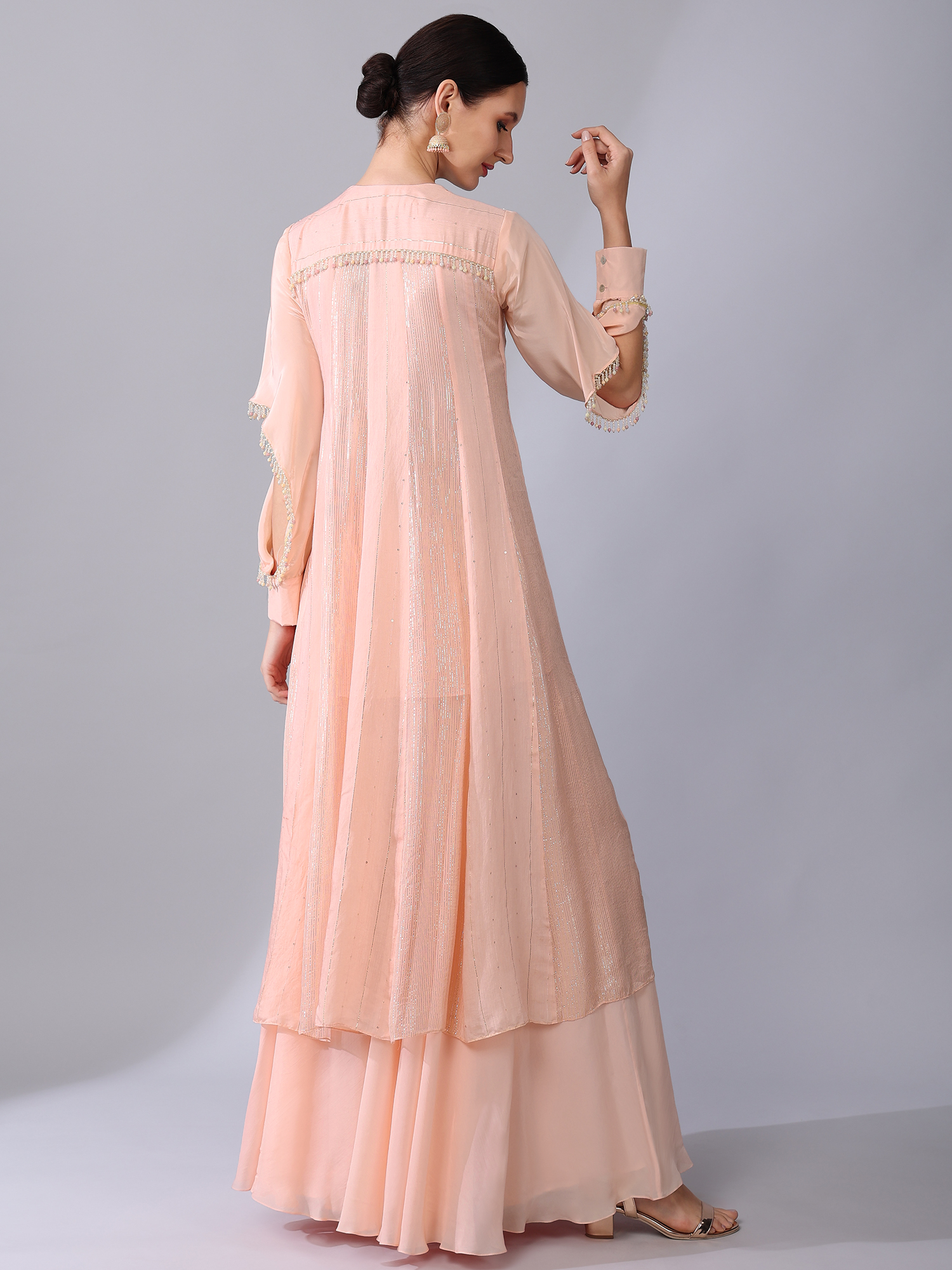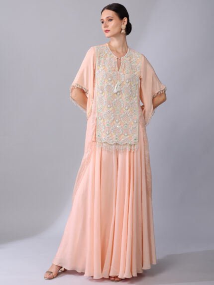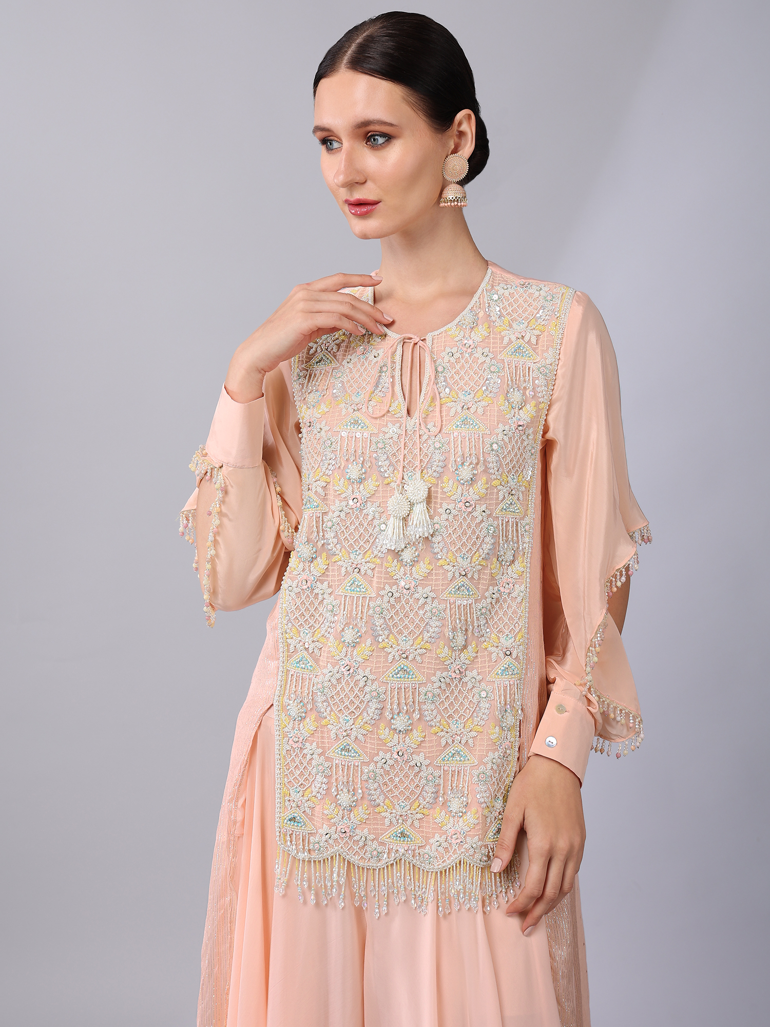 IVORY PEARL & SEQUINS EMBROIDERED TASSEL PANEL CHIFFON CREPE TUNIC PAIRED WITH A FLARE ORGANZA SILK PALAZZO
