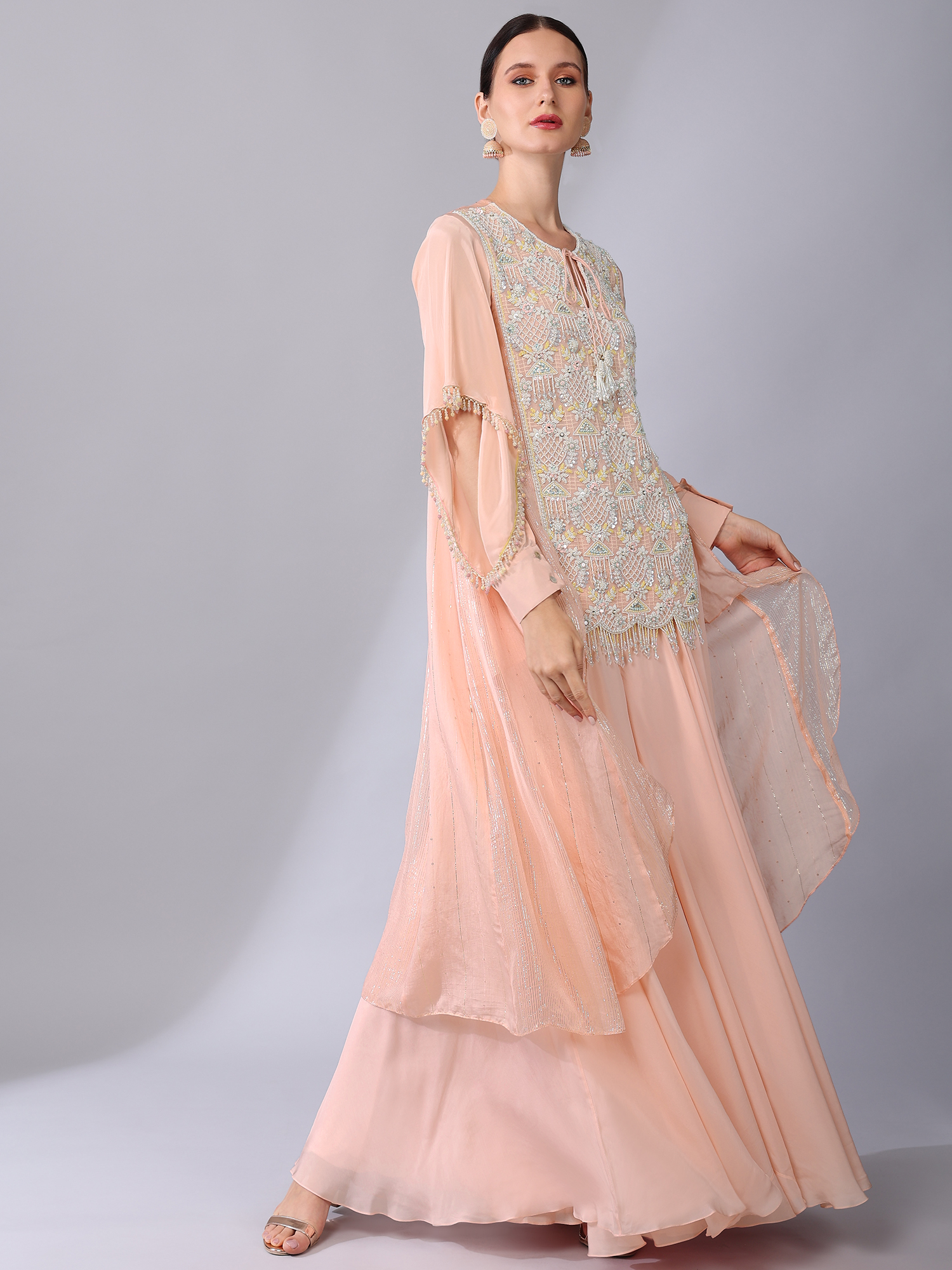 BLUSH PINK EMBELLISHED YOKE TIER TUNIC & PALAZZO SET
