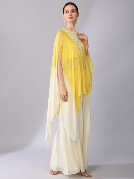 FLOWER SEQUINS MOTIF EMBROIDERED YOKE CHIFFON CREPE ONE SIDE OMBRÉ TUNIC PAIRED WITH AN ORGANZA SILK FLARE PALAZZO
