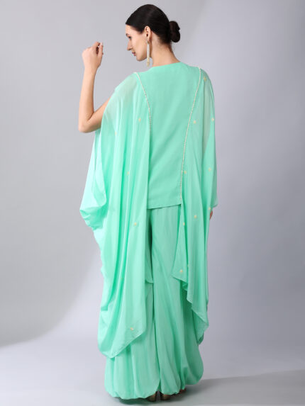 BLUE FLOWER EMBROIDERED SILK ORGANZA TUNIC PAIRED WITH A SMALL MOTIF EMBELLISHED SILK ORGANZA BALLOON PALAZZO