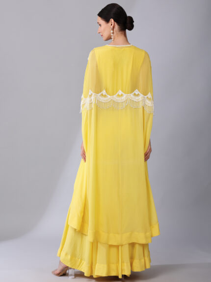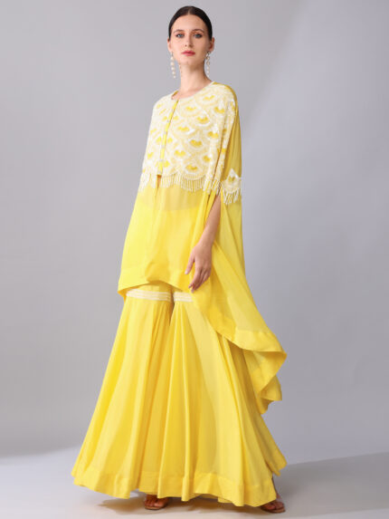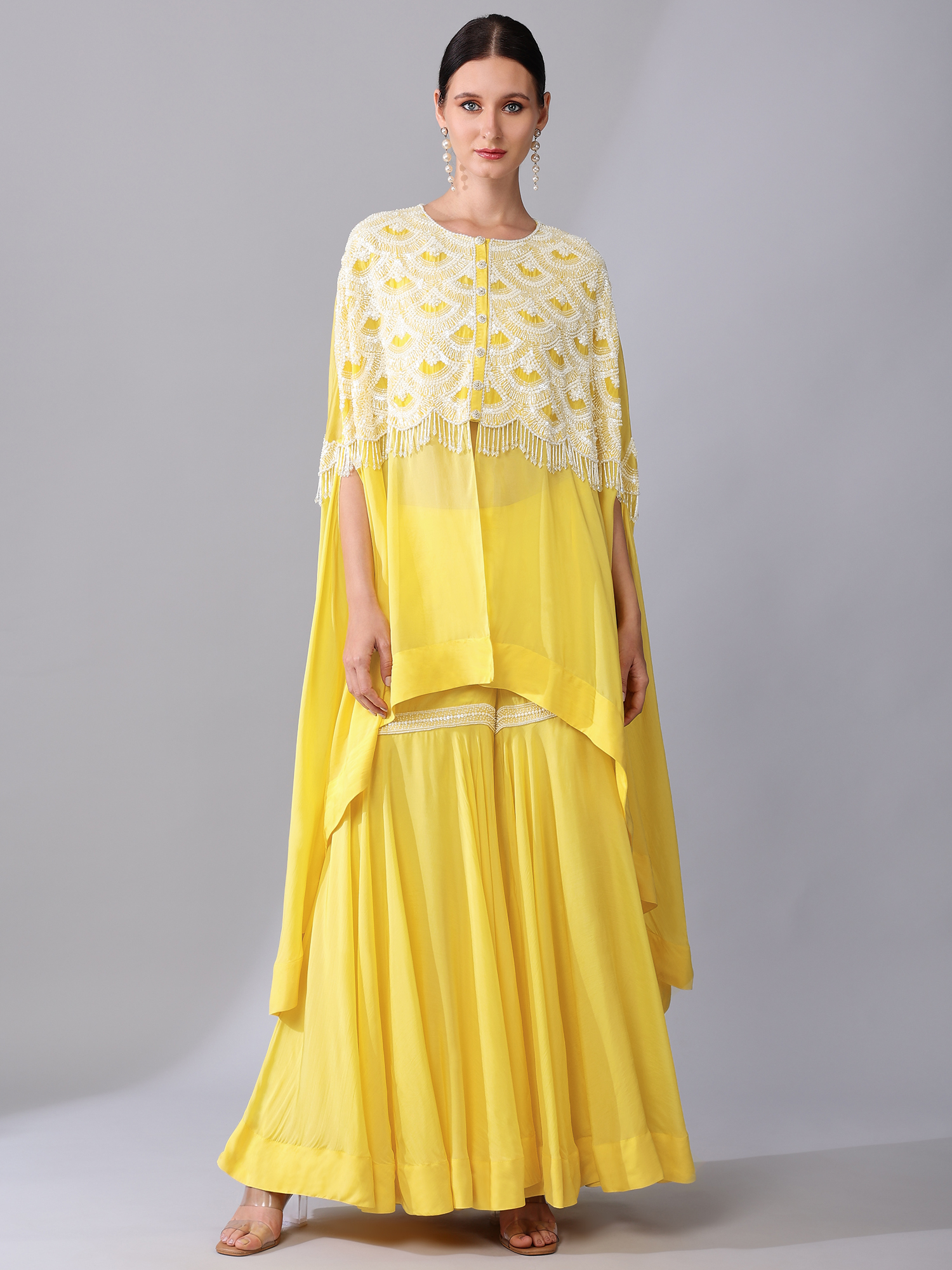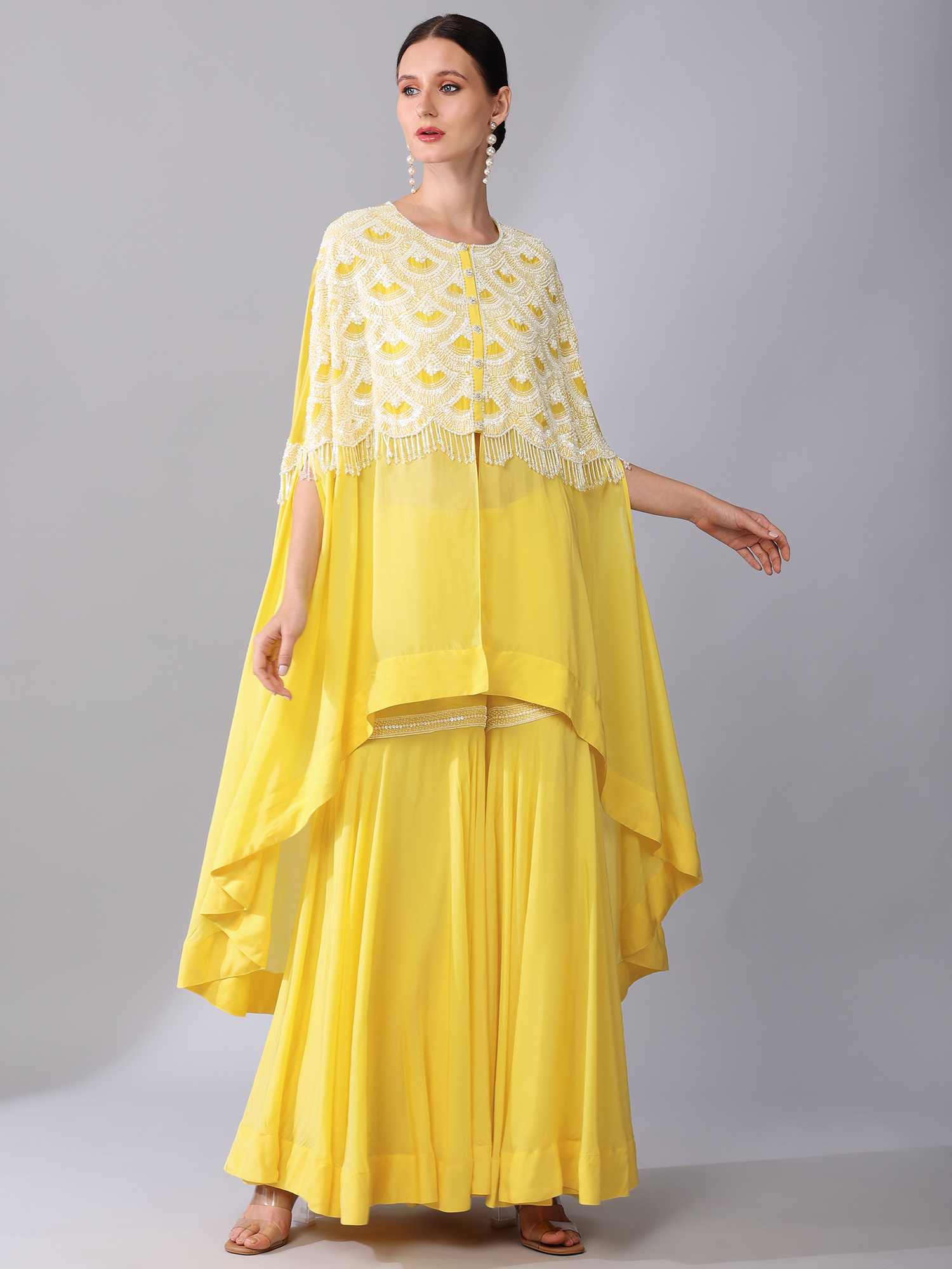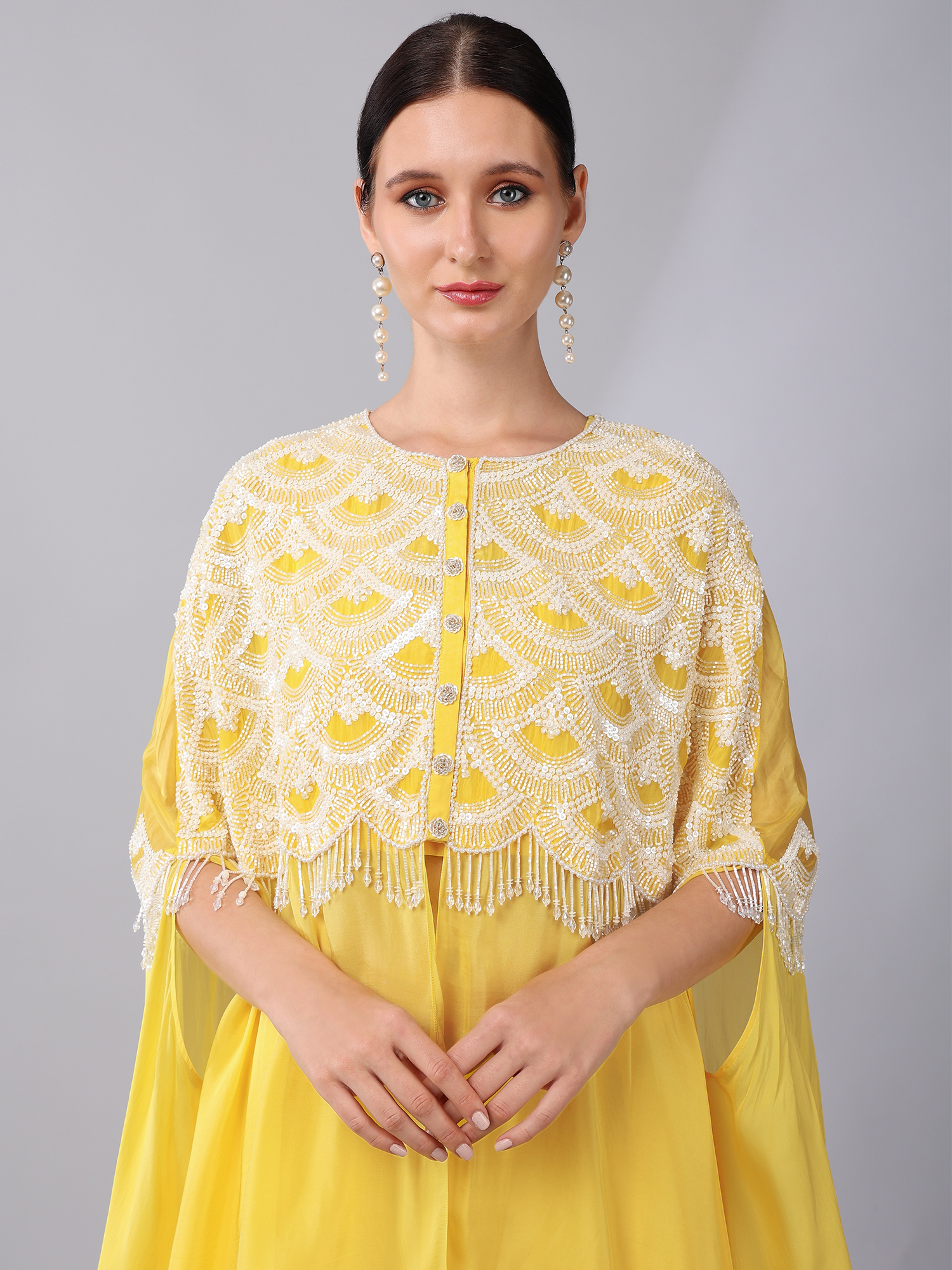 IVORY BEAD EMBROIDERED YELLOW CAPE & PALAZZO SET