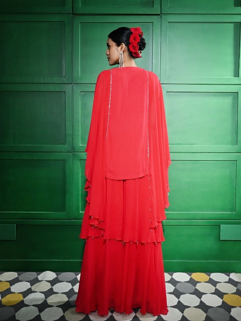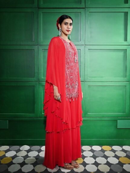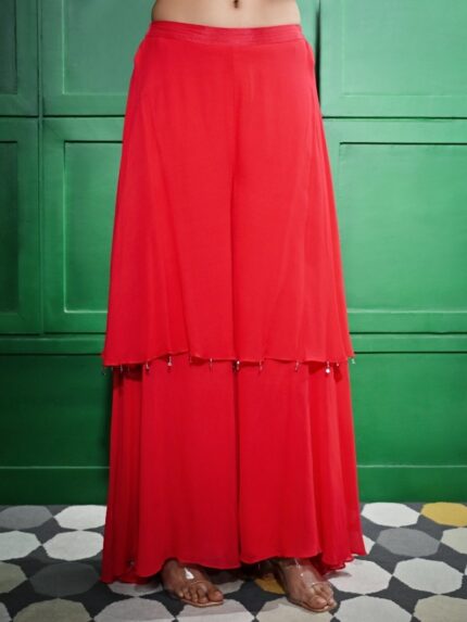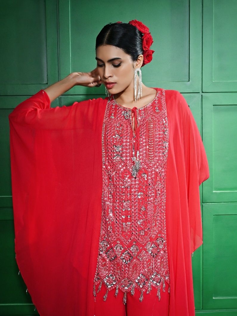 GOLD SEQUIN AND GLASS BEAD EMBROIDERED RED KAFTAN SLEEVES GEORGETTE TUNIC PAIRED WITH A DOUBLE LAYER GEORGETTE PALAZZO