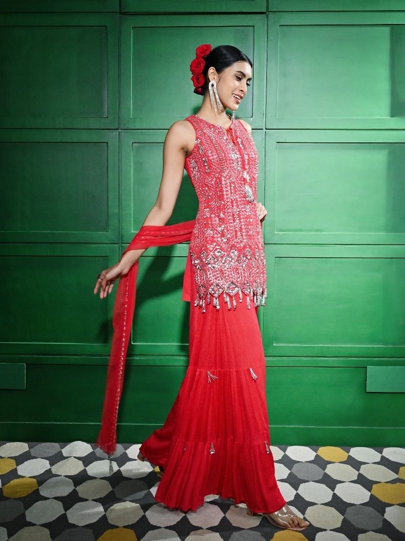 EMBROIDERED CROPTOP PAIRED WITH A CREPE SKIRT & AN EMBROIDERED ORGANZA DRAPE