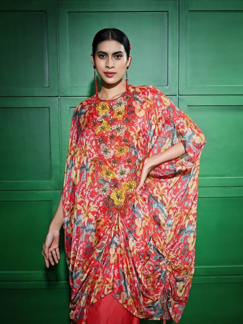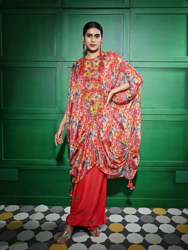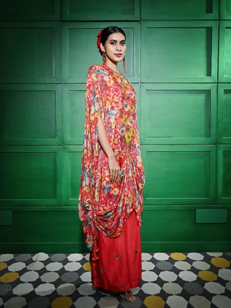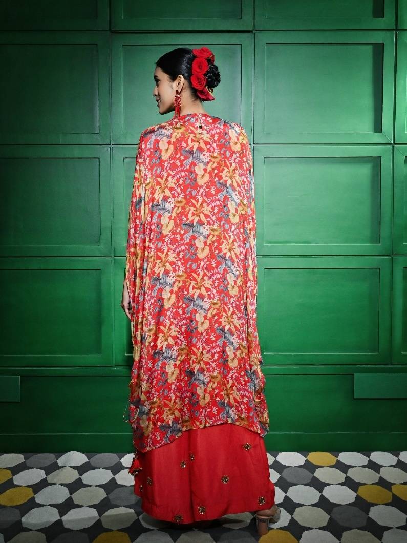 RED GEORGETTE PRINTED KAFTAN WITH A SIDE DRAWSTRING EMBROIDERED WITH CUTWORK ORGANZA EMBELLISHED FLOWERS PAIRED WITH A BOOTI EMBROIDERED SILK FLARE PANT & A SEPARATE LYCRA SLIP