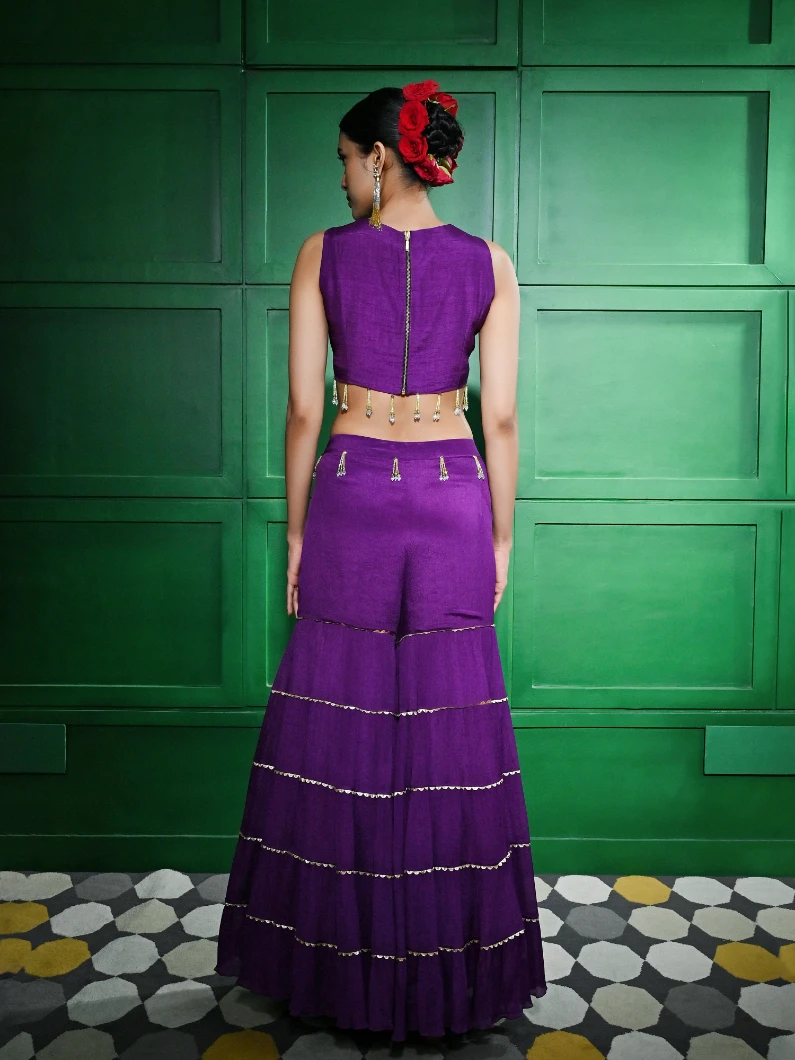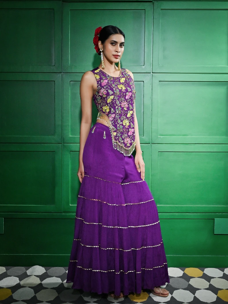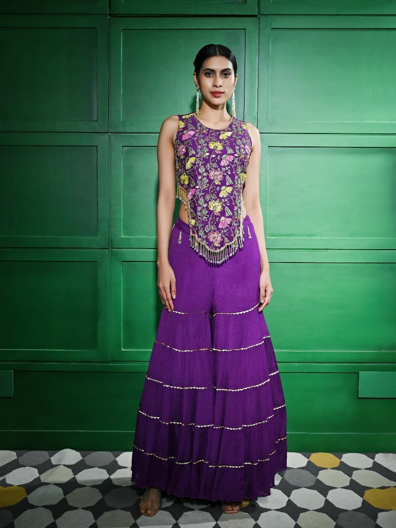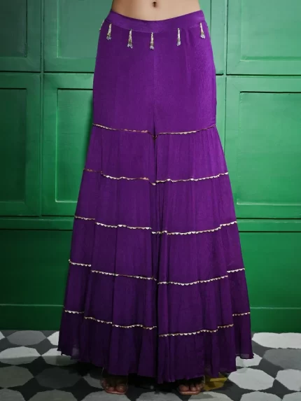MULTICOLORED BEAD AND MIRROR EMBROIDERED PURPLE CHIFFON CREPE BLOUSE PAIRED WITH A TIER INSERT GOTA LACE GHARARA