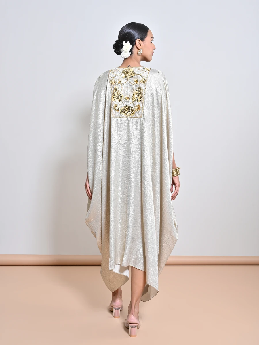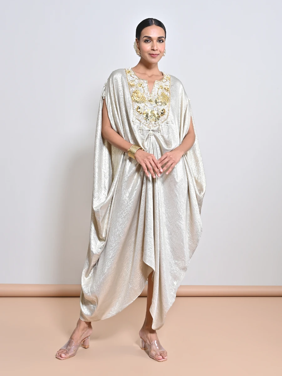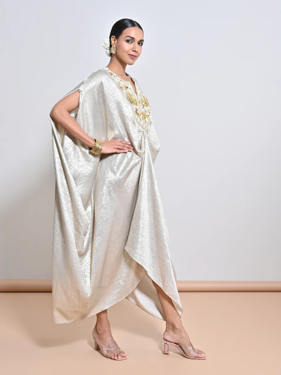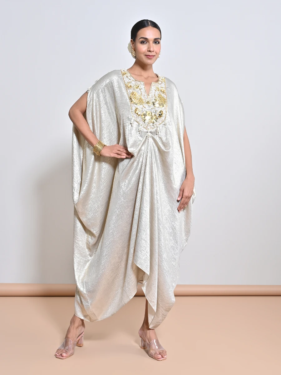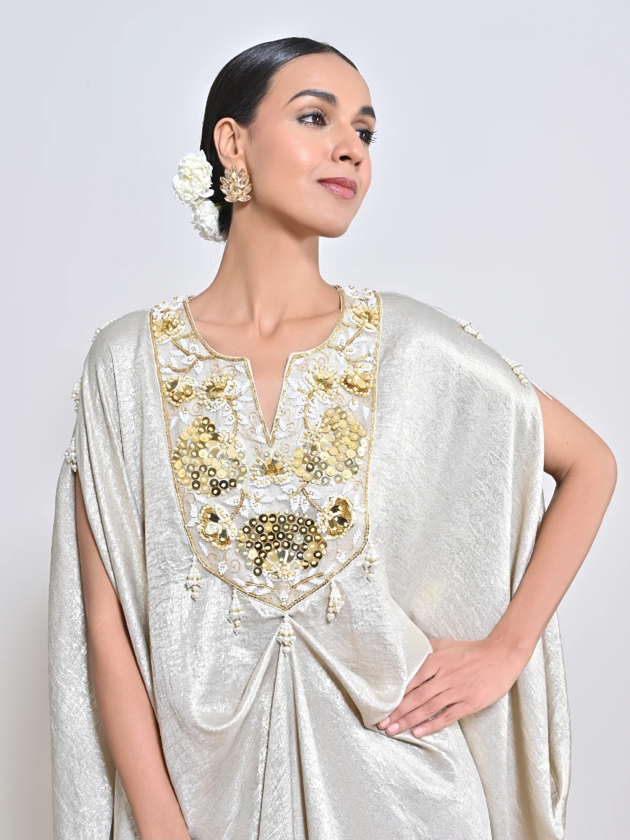 IVORY BEAD & MIRROR EMBELLISHED FLOWER MOTIFS FOIL CREPE DRAPE KAFTAN