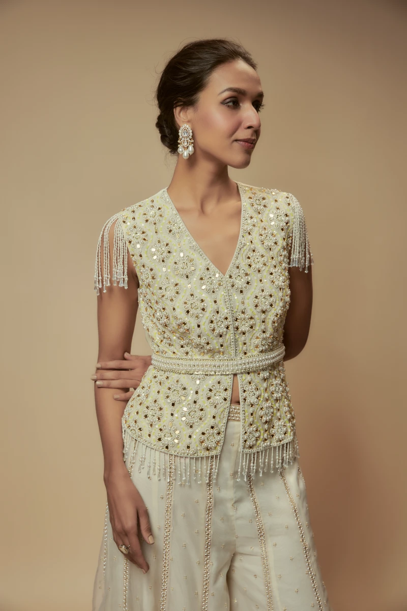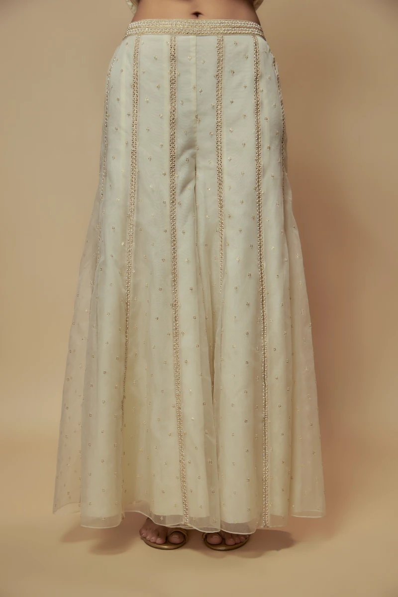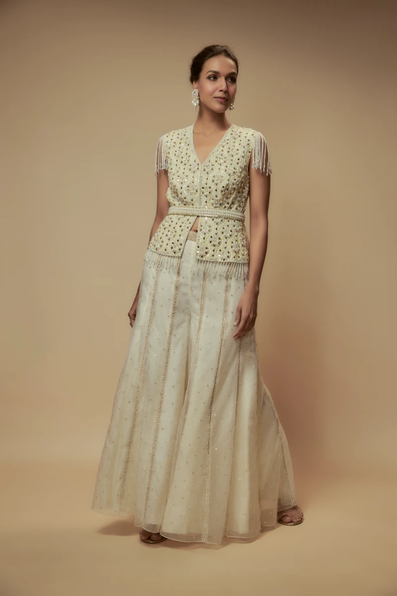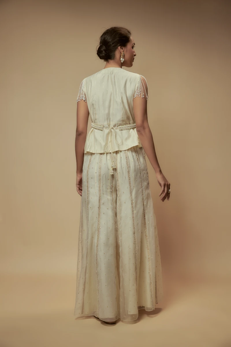 IVORY PEARL & MIRROR EMBROIDERED PEPLUM TOP WITH A PEARL EMBROIDERED PANEL ORGANZA PALAZZO