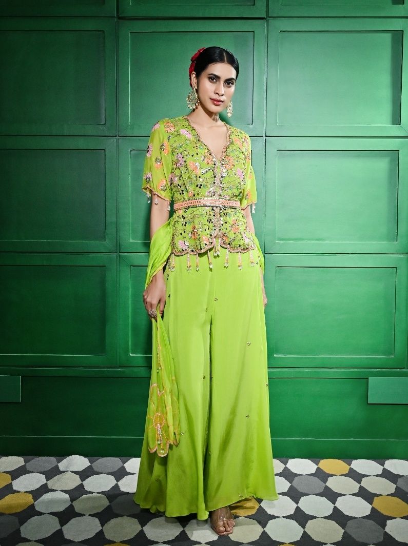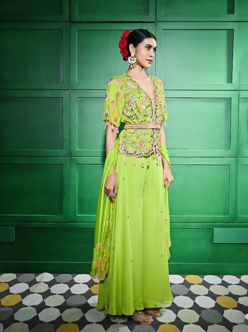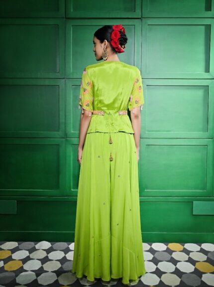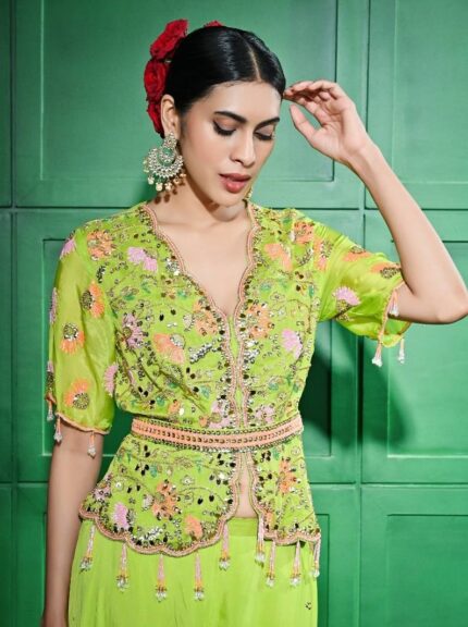 MULTICOLORED BEAD & MIRROR EMBROIDERED SILK ORGANZA PEPLUM TOP WITH A SEQUINS EMBROIDERED BELT PAIRED WITH A GREEN SILK ORGANZA SHARARA AND A BEAD EMBROIDERED SILK ORGANZA DUPATTA