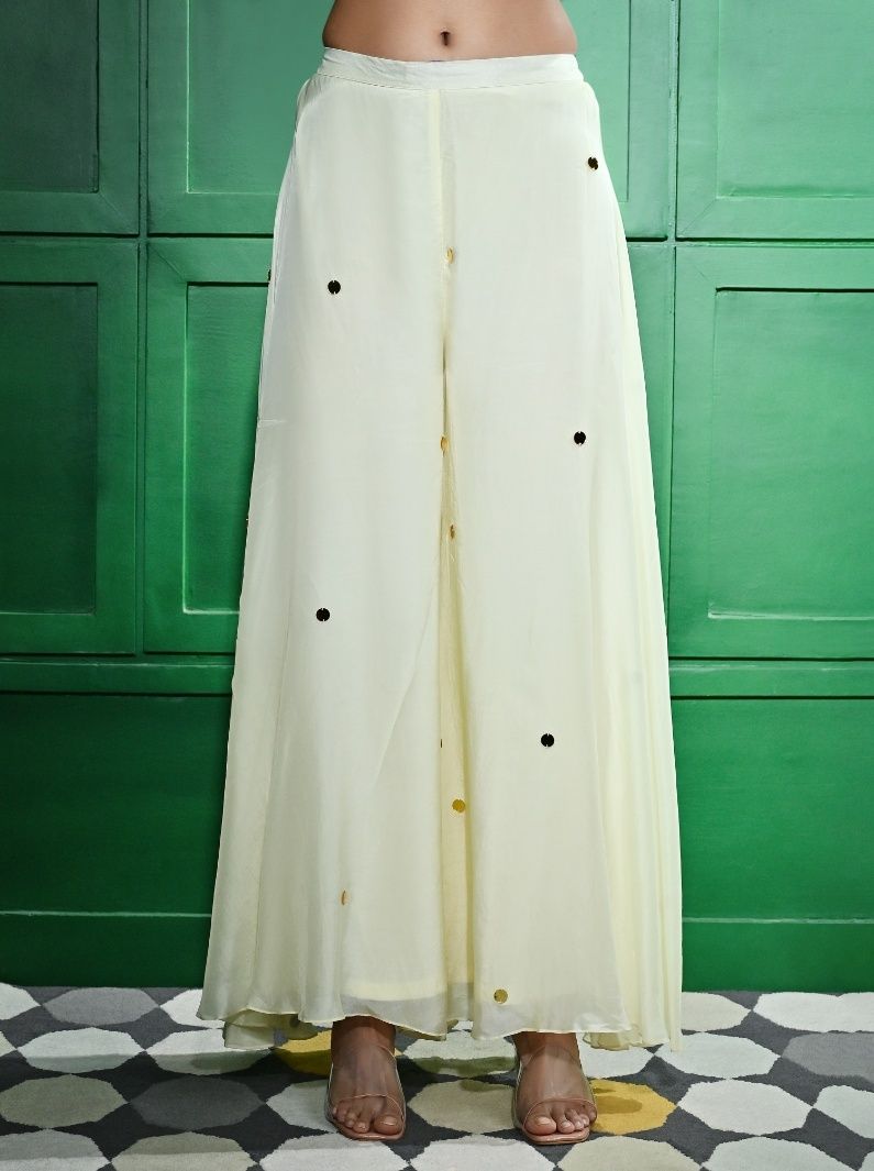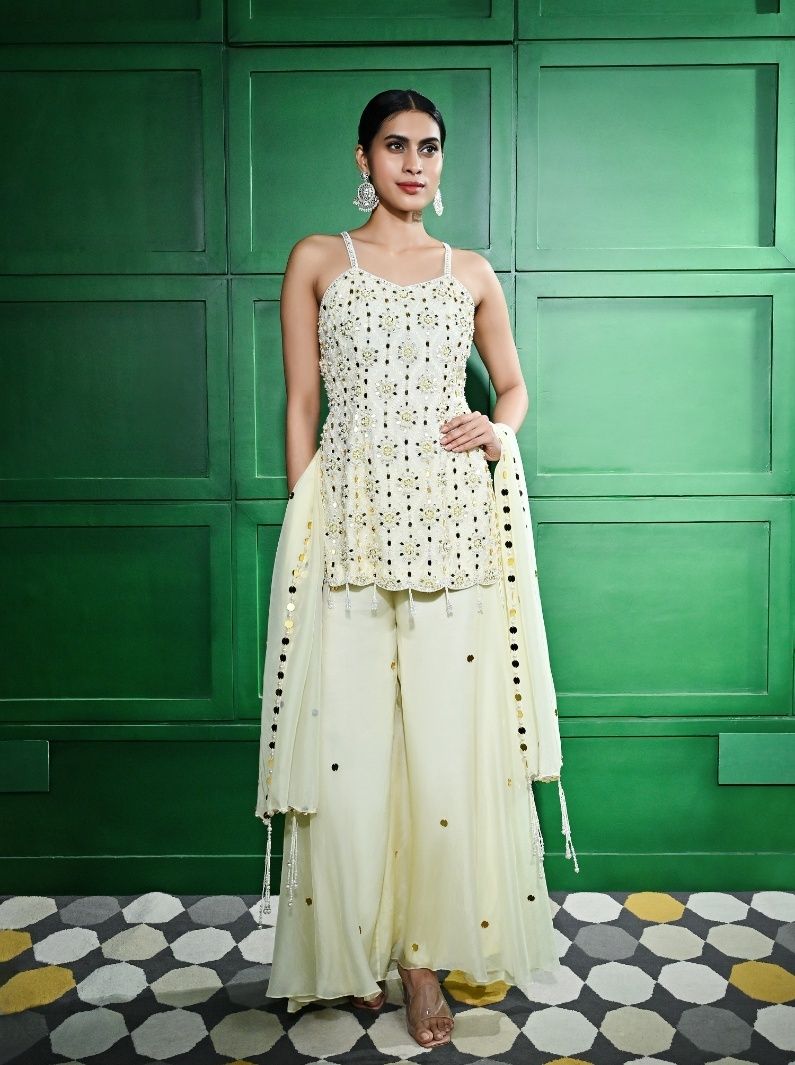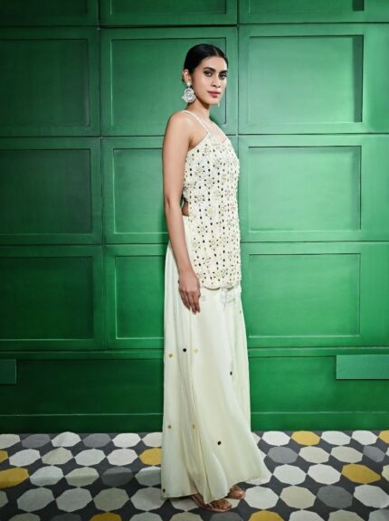 IVORY PEARL & MIRROR EMBROIDERED TUNIC PAIRED WITH A FLARE SILK ORGANZA PALAZZO AND A MIRROR EMBELLISHED SILK ORGANZA DUPATTA