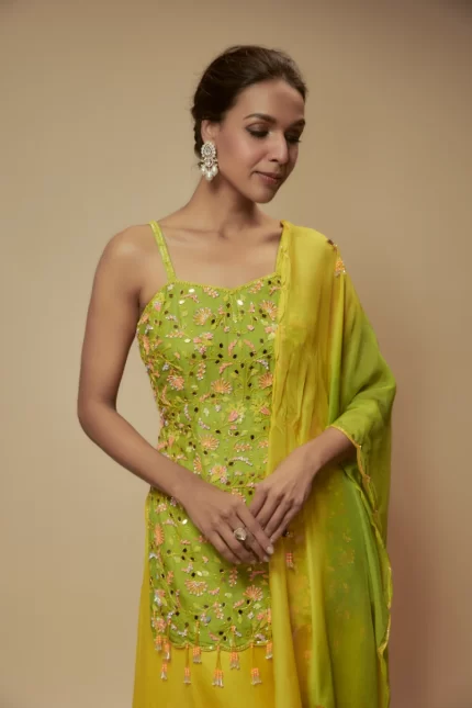 ORANGE & YELLOW SEQUINS EMBROIDERED TASSEL DROPS SILK ORGANZA TUNIC PAIRED WITH SILK ORGANZA SHARARA & A MIRROR EMBROIDERED SILK ORGANZA OMBRÉ DUPATTA