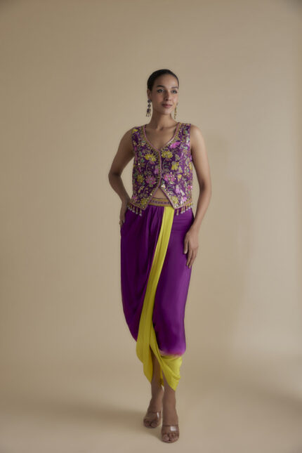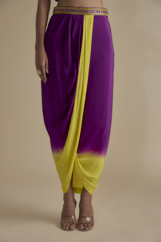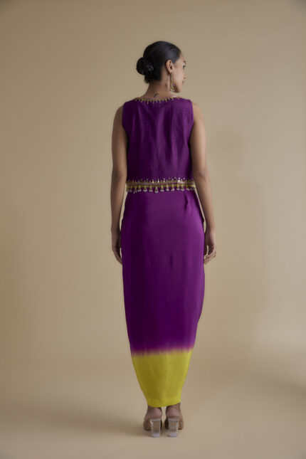 MULTI COLOR CUT DANA AND SEQUINS HEAVY EMBROIDERED OVERLAP RAW SILK BLOUSE PAIRED WITH OMBRÉ CREPE DRAPE SKIRT