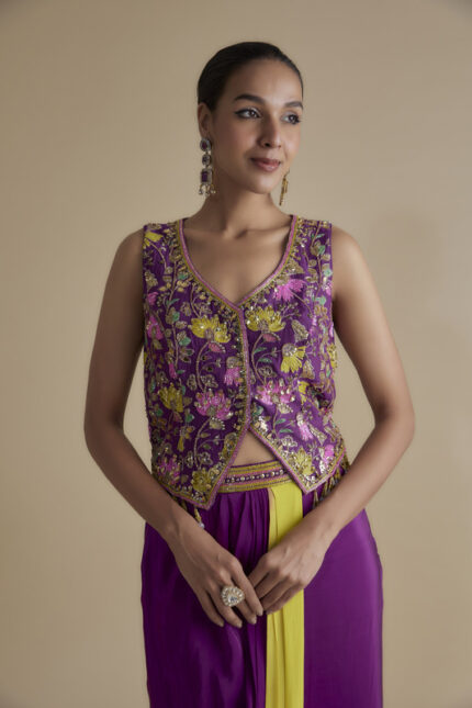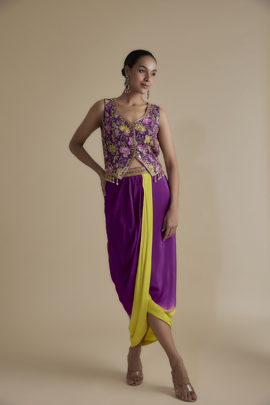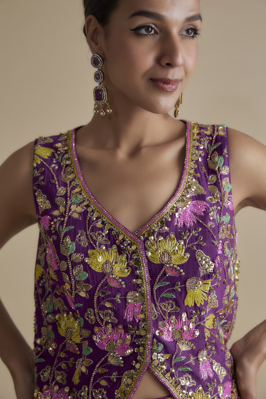 EMBROIDERED CROPTOP PAIRED WITH A CREPE SKIRT & AN EMBROIDERED ORGANZA DRAPE