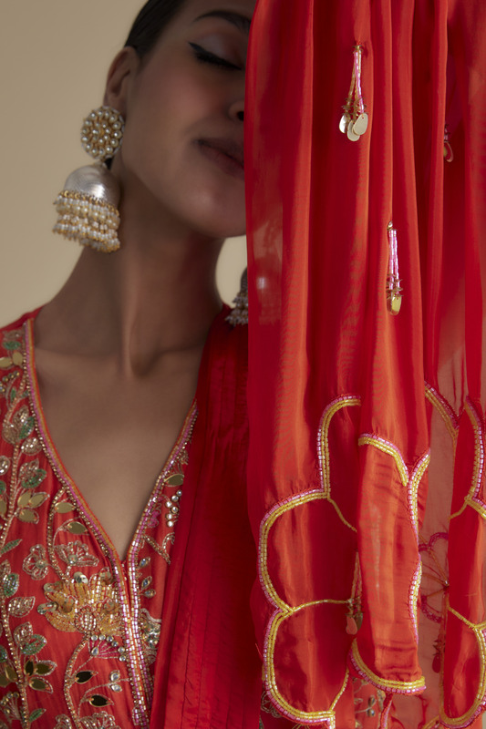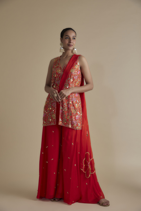 MULTI COLOR CUT DANA & GOLD SEQUINS HEAVY EMBELLISHED ORGANZA SILK TUNIC PAIRED WITH A SILK ORGANZA FLOWER MOTIFS EMBROIDERED DUPATTA ATTACHED TO A SEQUINS HIGHLIGHTED ORGANZA SILK PALAZZO