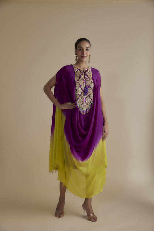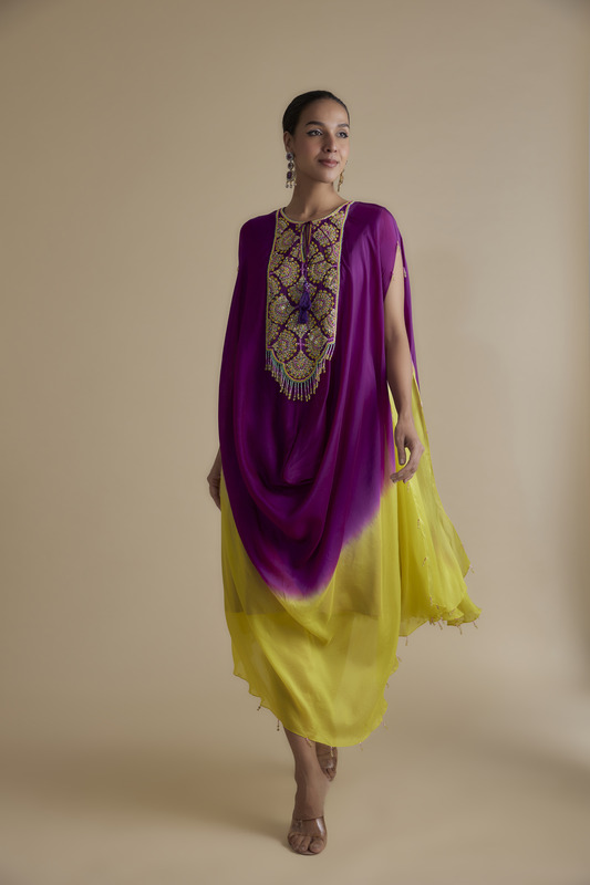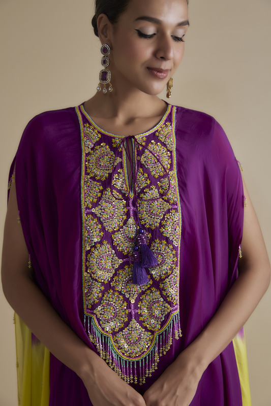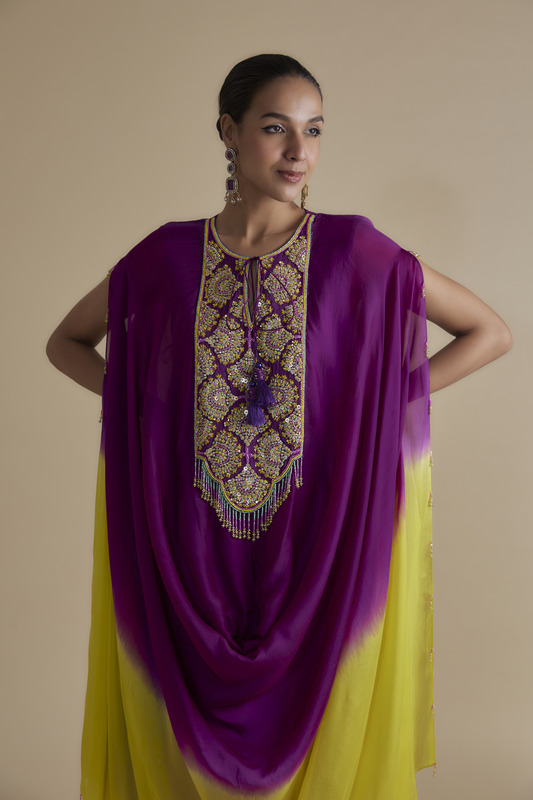 MULTICOLOURED SEQUINS EMBROIDERED OMBRÉ SILK ORGANZA KAFTAN DRESS PAIRED WITH A SEPERATE LYCRA SLIP