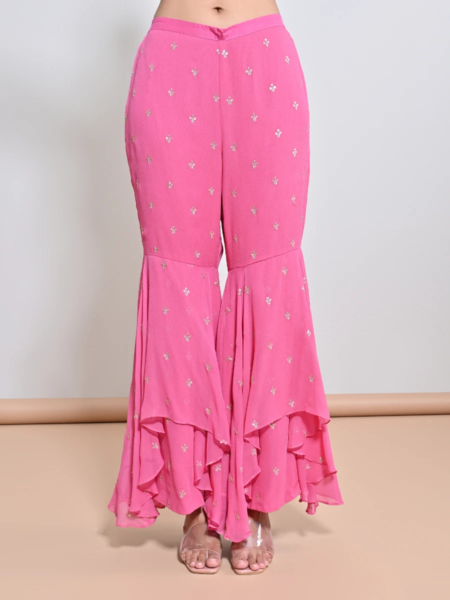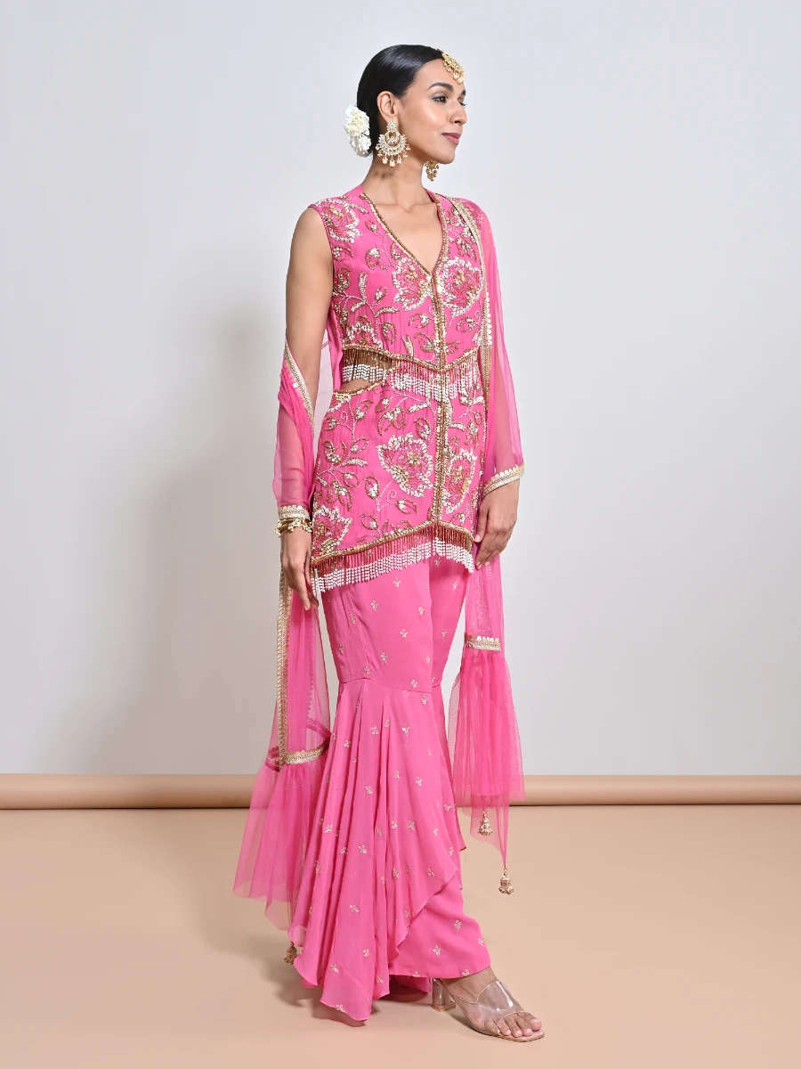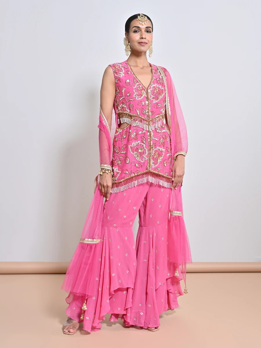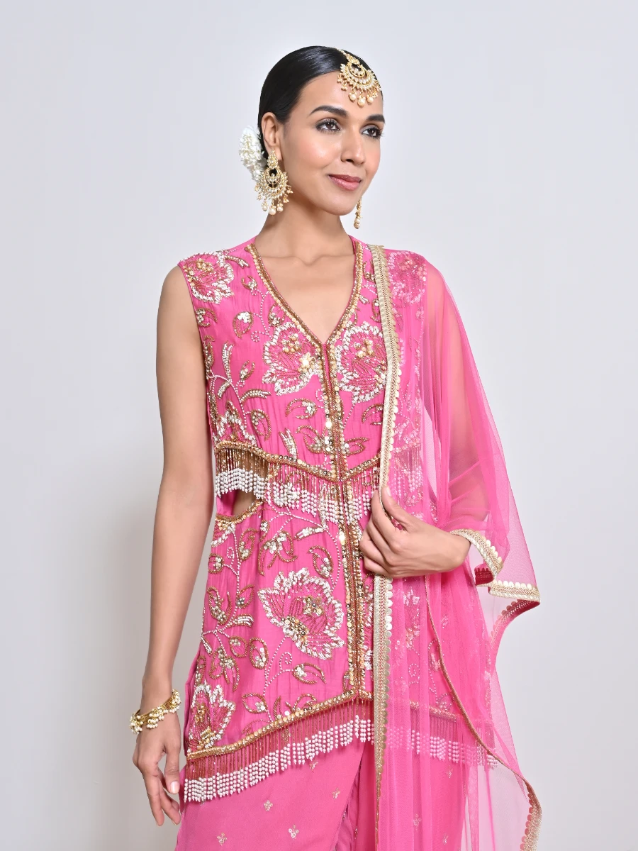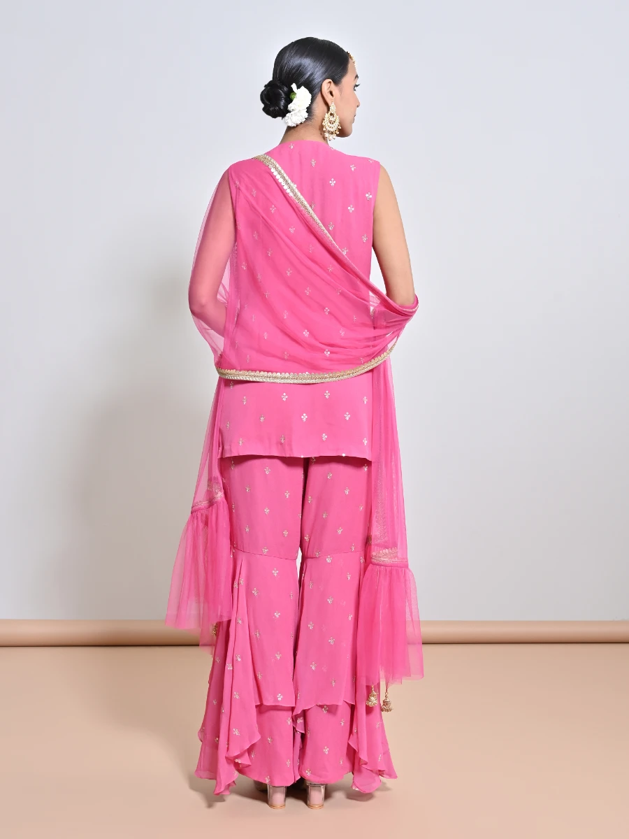 IVORY BEAD & MIRROR EMBELLISHED TASSEL GEORGETTE TUNIC PAIRED WITH GOLD MOTIF GEORGETTE GHARARA & A NET DUPATTA
