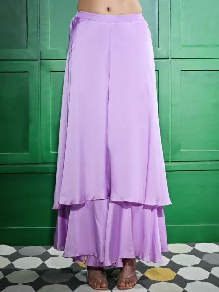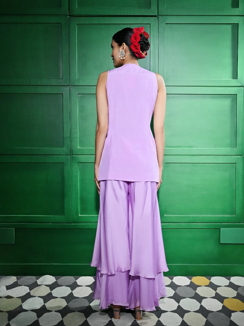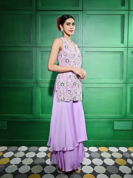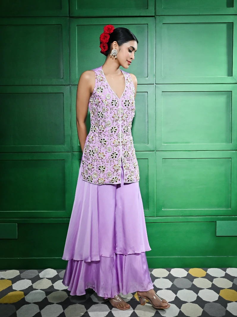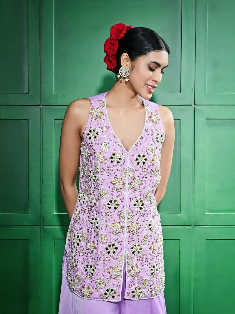 HEAVY PEARL & MIRROR EMBROIDERED SILK ORGANZA LILAC TUNIC PAIRED WITH A DOUBLE LAYER SILK ORGANZA PALAZZO