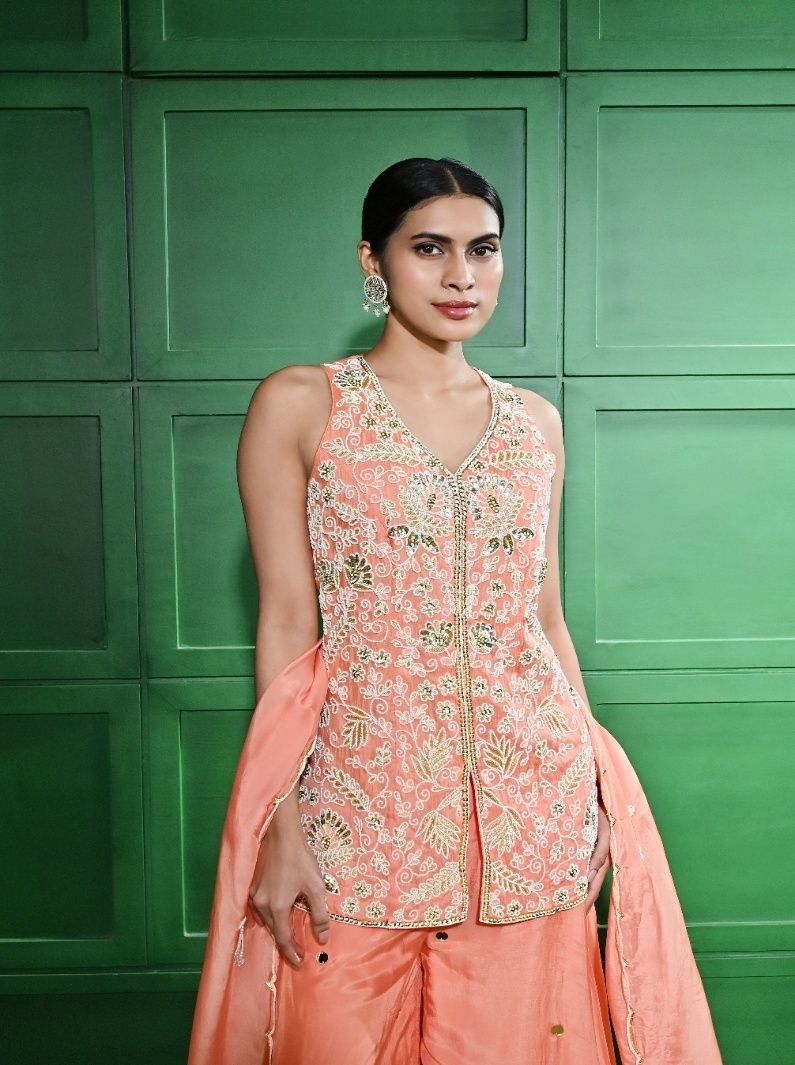 IVORY BEAD/SEQUINS & GOLD ZARI EMBROIDERED PEACH TUNIC PAIRED WITH A SILK ORGANZA FLARE SHARARA AND A SILK ORGANZA BOOTI EMBROIDERED SCALLOP DUPATTA