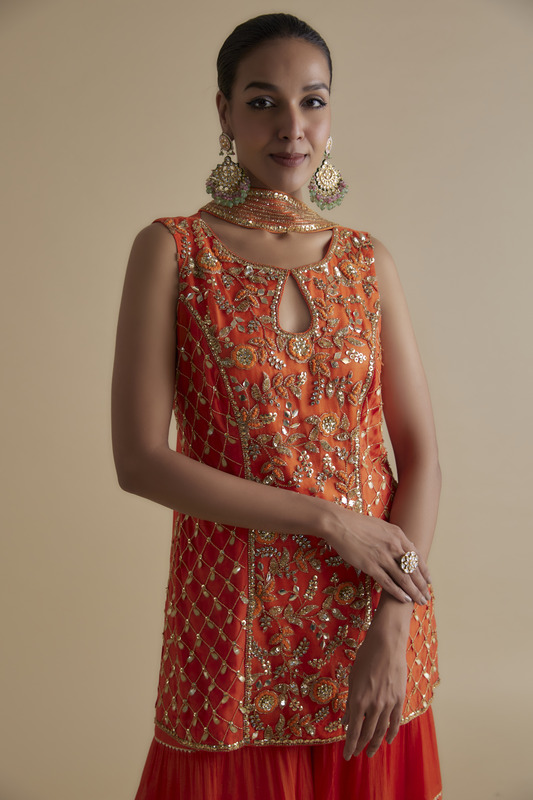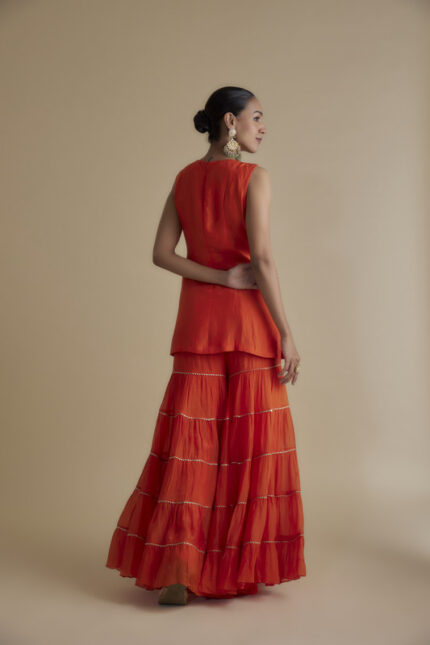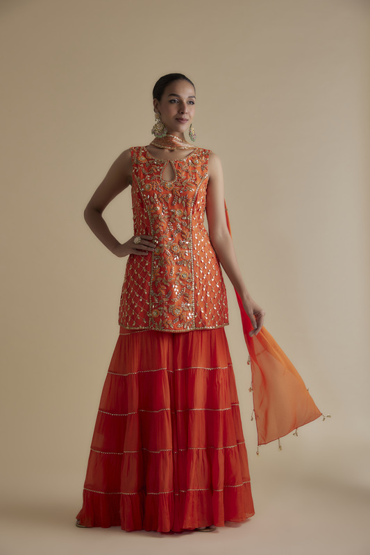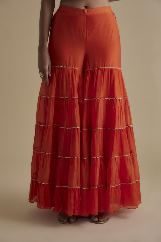 GOLD SEQUINS & THREAD EMBROIDERED SILK ORGANZA TUNIC PAIRED WITH A SILK ORGANZA & CHIFFON CREPE TIER PALAZZO AND A EMBROIDERED CHOKER SILK ORGANZA TASSEL DUPATTA