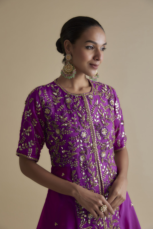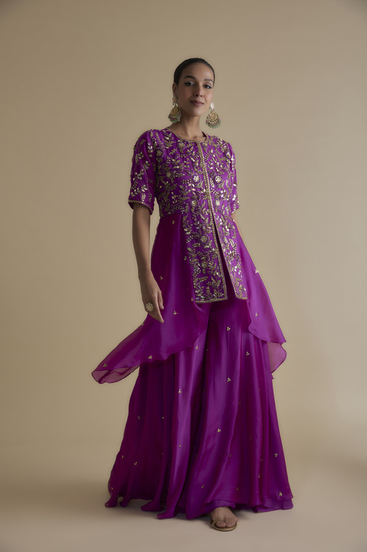 GOLD SEQUINS & THREAD EMBROIDERED SILK ORGANZA TUNIC PAIRED WITH A SILK ORGANZA FLARE SEQUINS HIGHLIGHTED PALAZZO
