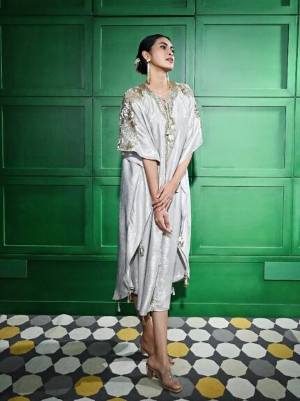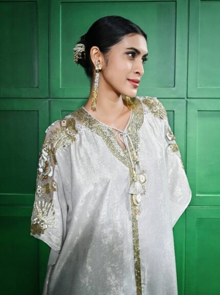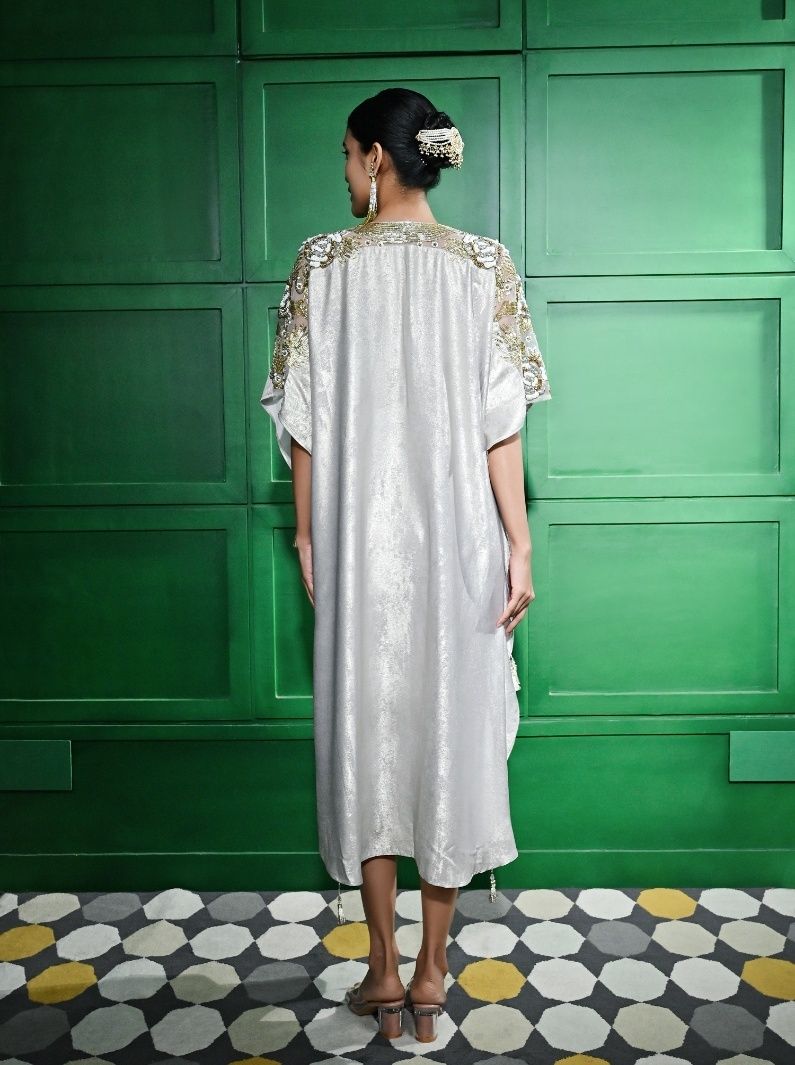 LIGHT GOLD FOIL CREPE KAFTAN WITH A GOLD & SILVER GLASS BEAD EMBROIDERED ORGANZA SLEEVE
