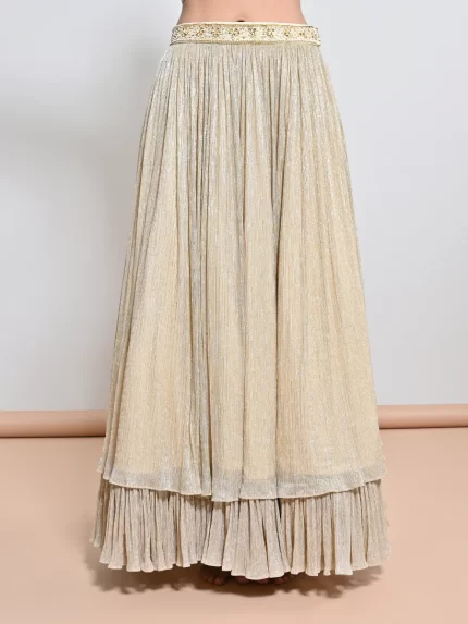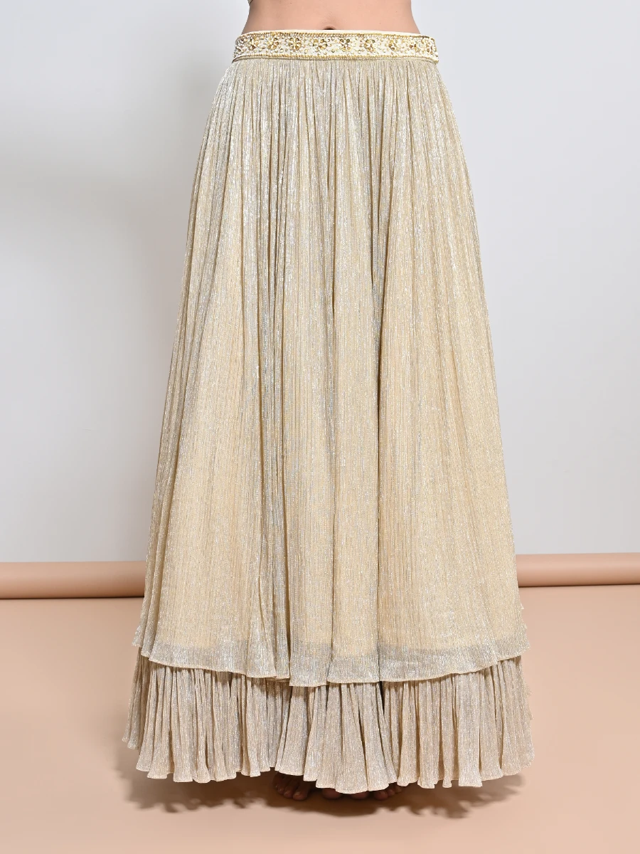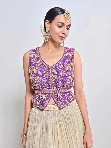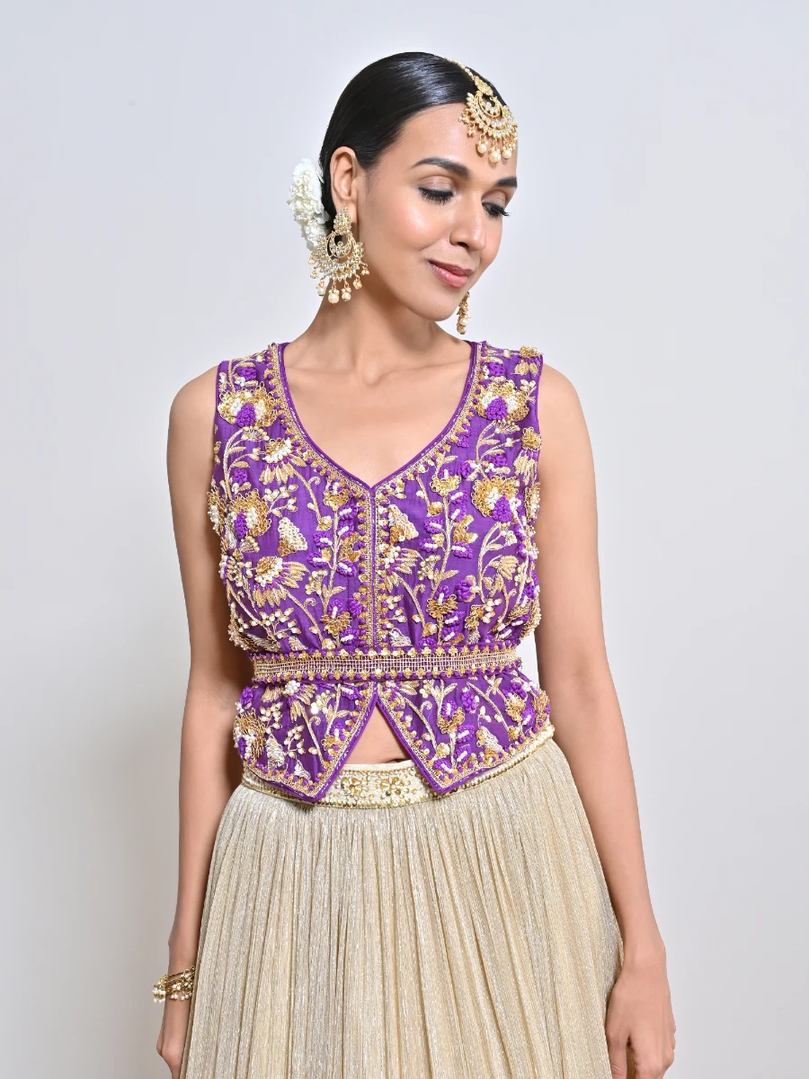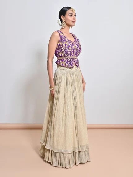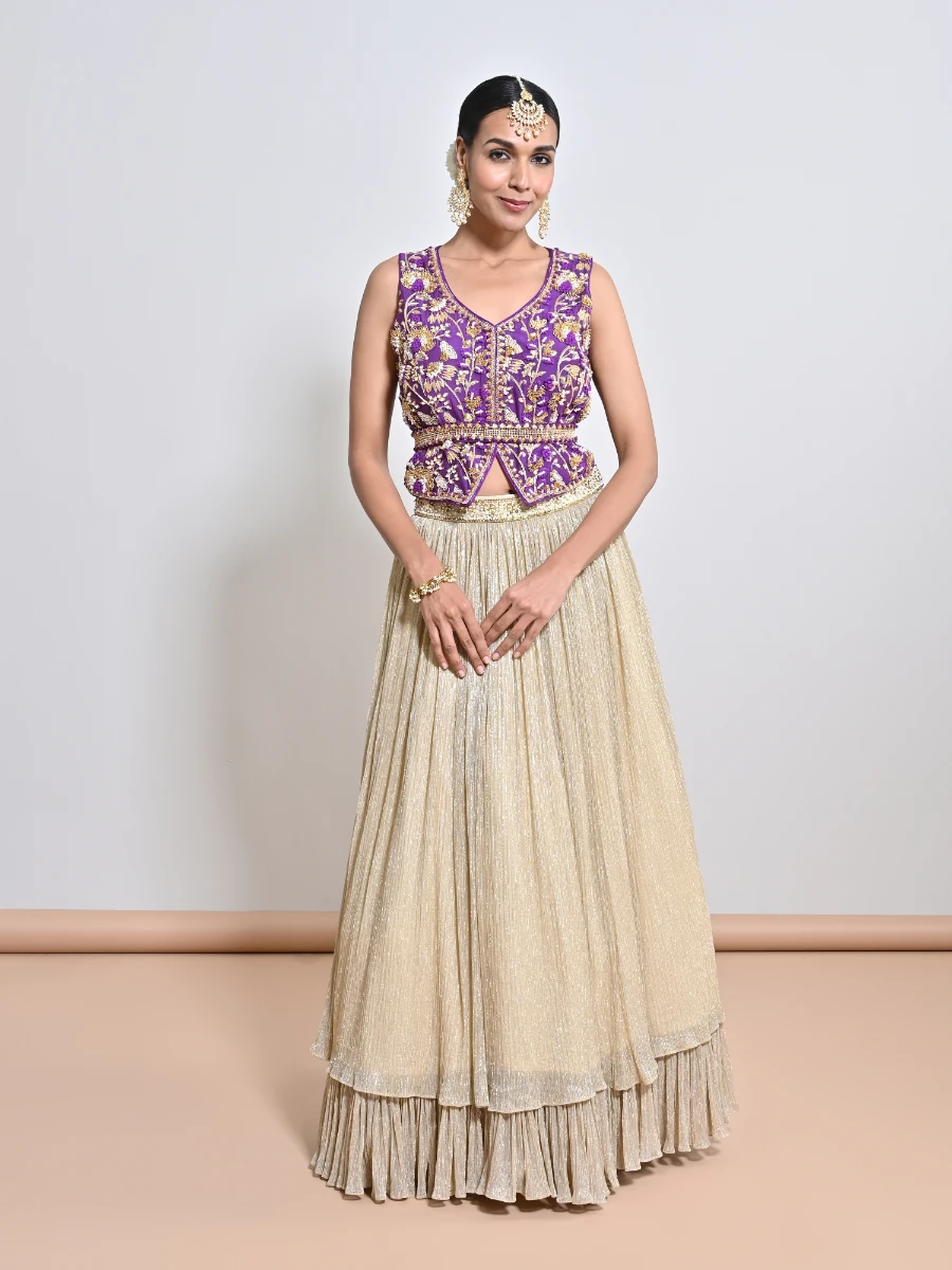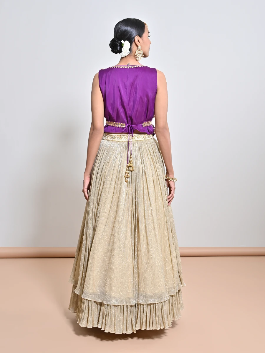 GOLD ZARDOZI EMBROIDERED PURPLE SILK ORGANZA PEPLUM TOP PAIRED WITH A SEPERATE HAND EMBROIDERED BELT & A CRUSH CHIFFON ZARI DOUBLE LAYER GATHERED SKIRT WITH A NET INNER LAYER
